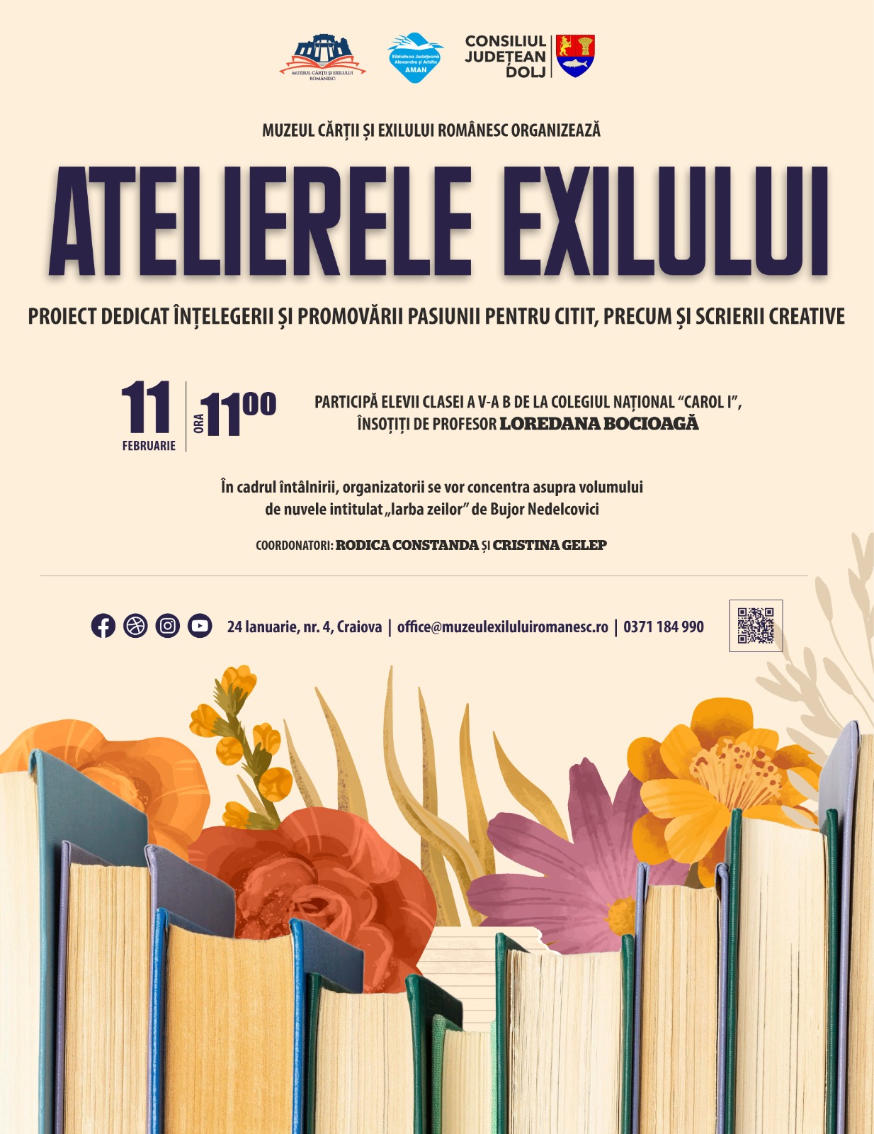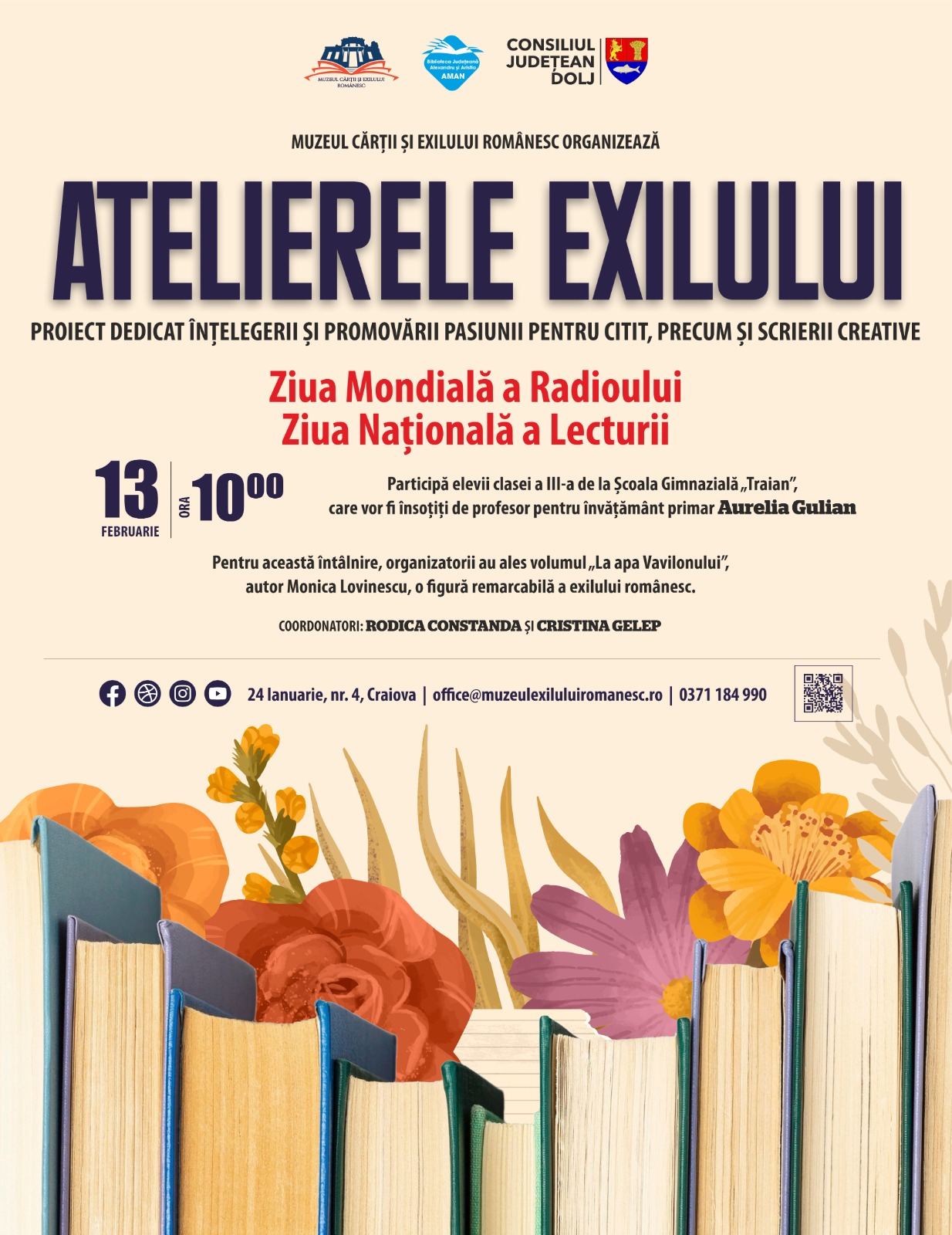 Muzeul Cărții și Exilului Românesc organizează miercuri, 11 februarie 2026, la ora 11, prima întâlnire din cadrul proiectului Atelierele exilului, dedicat înțelegerii și promovării pasiunii pentru citit, precum și scrierii