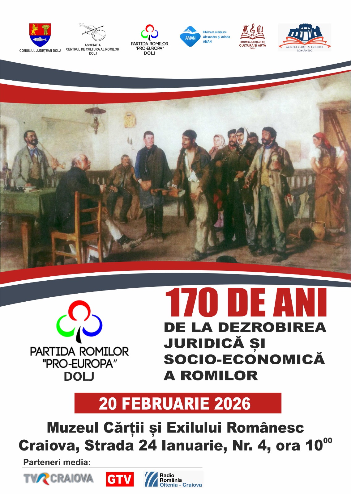 Muzeul Cărții și Exilului Românesc găzduiește vineri, 20 februarie 2026, la ora 10, un eveniment comemorativ organizat de Asociația Partida Romilor Pro-Europa – Sucursala Dolj. Dedicat împlinirii a 170 de