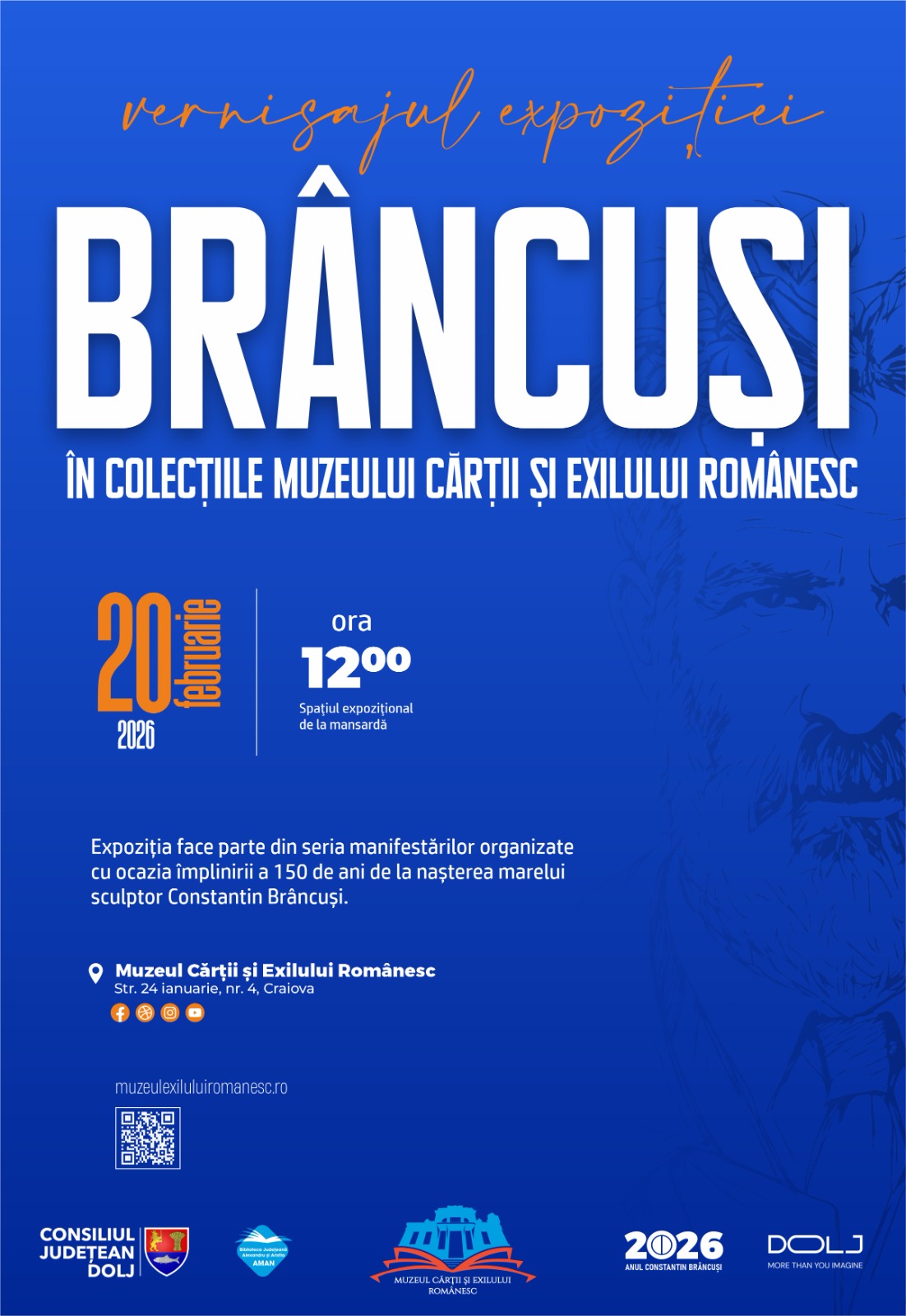 Muzeul Cărții și Exilului Românesc găzduiește duminică, 22 februarie 2026, vernisajul expoziției itinerante BRÂNCUȘI 150, organizată de Centrul Brâncuși Târgu Jiu, ce face parte din seria manifestărilor organizate cu prilejul