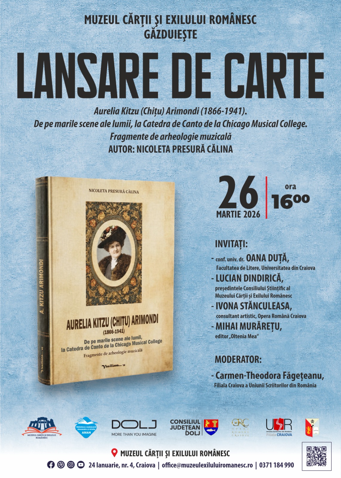 Muzeul Cărții și Exilului Românesc găzduiește joi, 26 martie 2026, la ora 16.00, lansarea volumului „Aurelia Kitzu (Chițu) Arimondi (1866-1941). De pe marile scene ale lumii, la Catedra de Canto