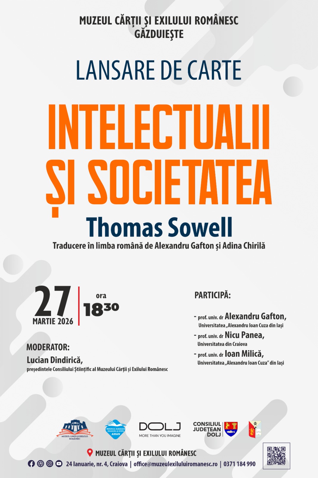 Muzeul Cărții și Exilului Românesc găzduiește vineri, 27 martie 2026, la ora 18.30, lansarea volumului Intelectualii și societatea, autor Thomas Sowell, tradus în limba română de Alexandru Gafton și Adina